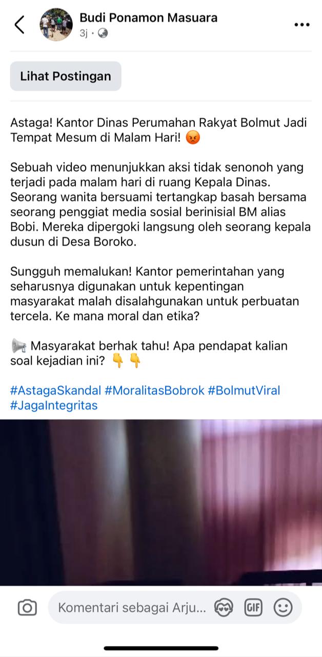 Kemudian, Budi Ponamon Masuara juga menambahkan pada deskripsi postingannya “Sebuah video menunjukkan aksi tidak senonoh yang terjadi pada malam hari di ruang Kepala Dinas. Seorang wanita bersuami tertangkap basah bersama seorang penggiat media sosial berinisial BM alias Bobi. Mereka dipergoki langsung oleh seorang kepala dusun di Desa Boroko. Sungguh memalukan! Kantor pemerintahan yang seharusnya digunakan untuk kepentingan masyarakat malah disalahgunakan untuk perbuatan tercela. Ke mana moral dan etika?,” kutip postingan Budi pada halaman facebooknya. Dengan menambahkan hastag #AstagaSkandal #MoralitasBobrok #BolmutViral #JagaIntegritas.